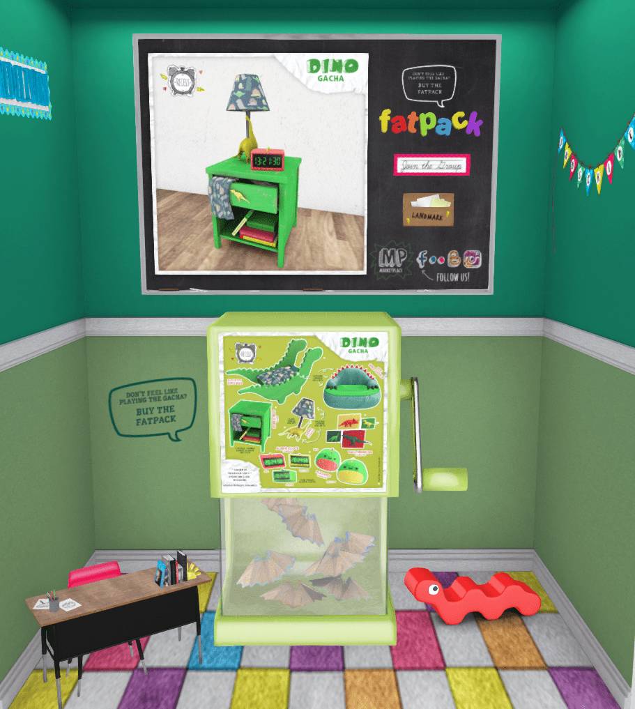 The couch and fluffy dino are part of a gacha by Recess that cost 75L per pull or 1,500L for the fatpack.